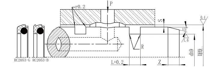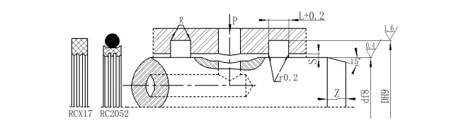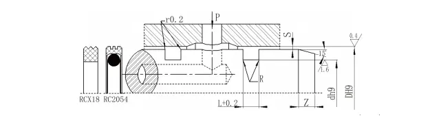 RC2054| Діапазон діафрагми D H9 | Діаметр канавки D H9 | Ширина канавка Л+0.2 | Радіальний зазор sмаксимум | Округлі кути Rмаксимум | Фаска Zхв | |