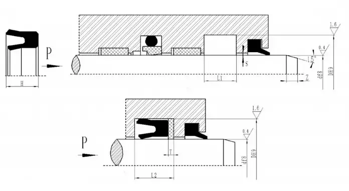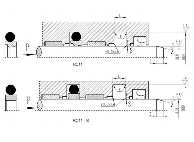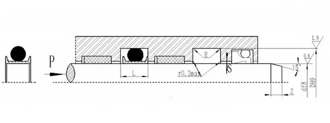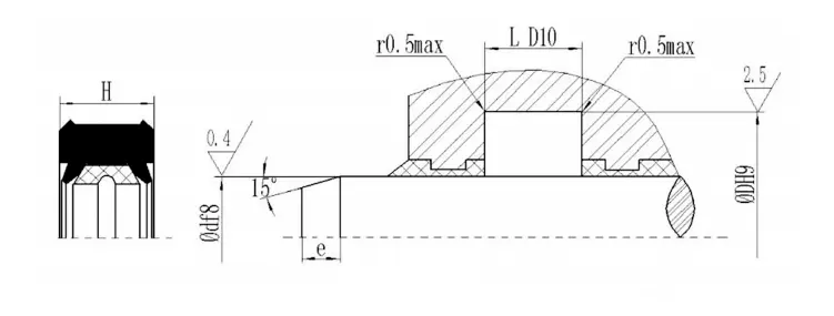 RC15 складається з набору (більше 3) V-подібних ущільнювальних кілець, кільця тиску та опорного кільця, і підходить для гідравлічного зворотно-поступального руху одностороннього герметичного тиску. Масло, сумісна з ущільнювальним матеріалом, повинна застосовуватися під час встановлення. Він не може бути встановлений в інтегральній (закритої) канавці. Особливості: